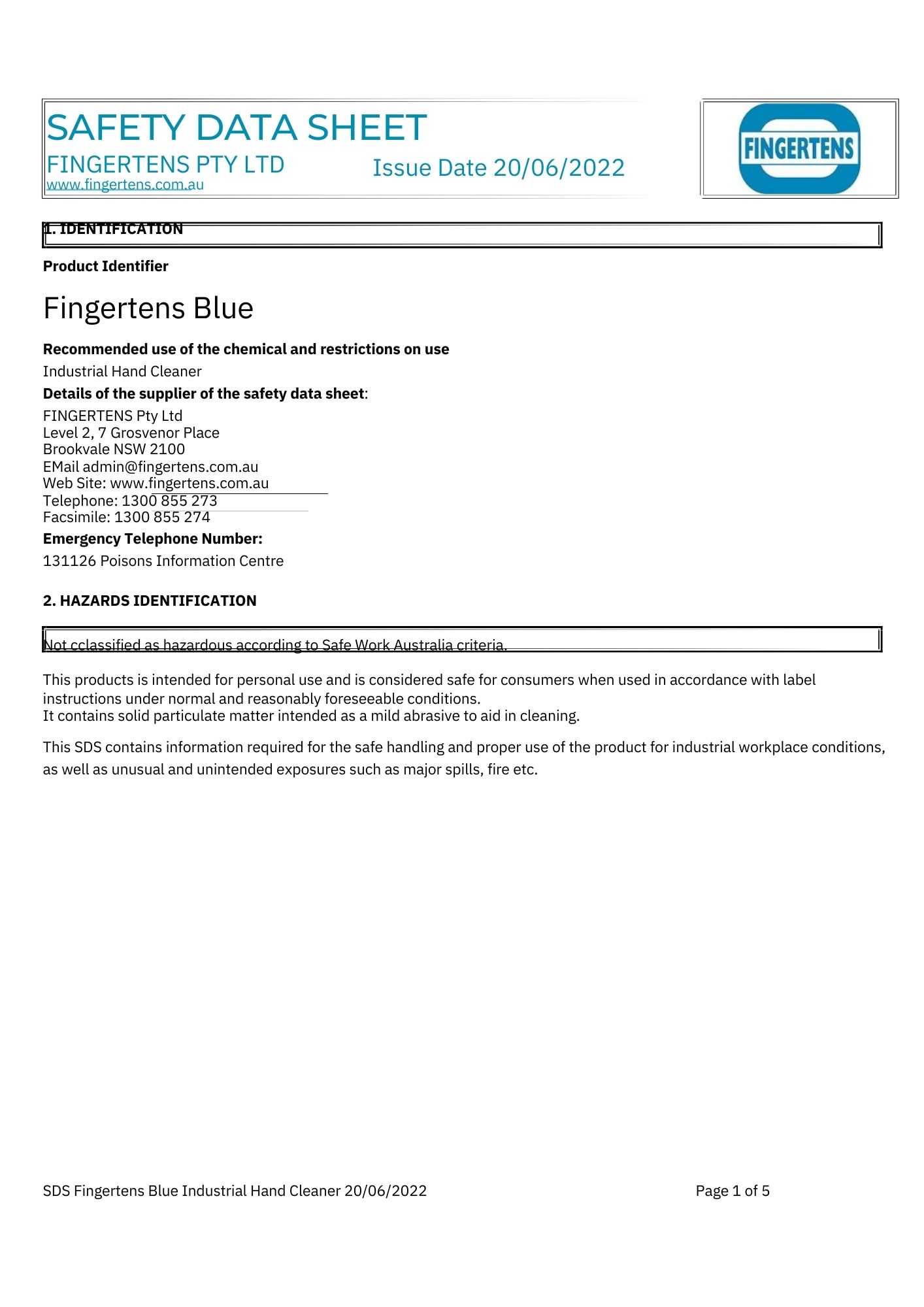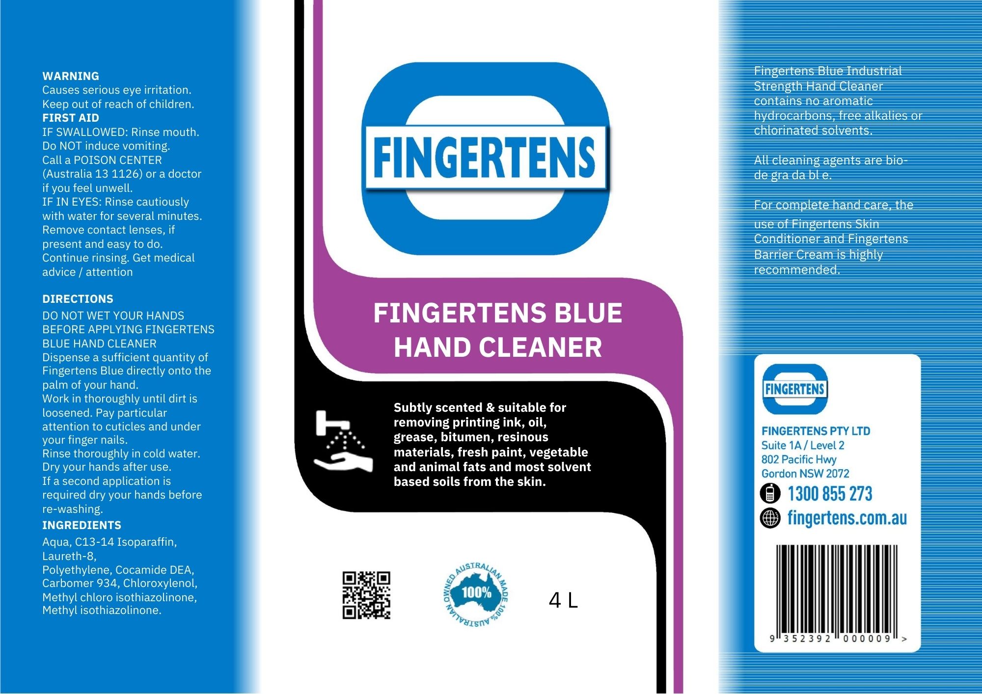 Fingertens Blue easily removes oil, grease, fresh paint, bitumen, vegetable and animal fats, resinous materials, printing ink (including process blue and warm red), cutting oils, cement, mortar, plaster, glues and paste adhesives. Most suitable for greasy through to dry soils. Real strength with, a built in scrubber for engineers, motor mechanics, tradies etc.